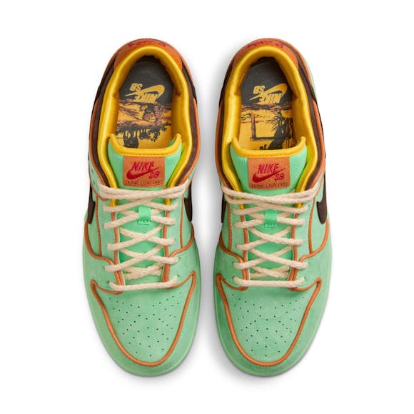 This ain’t just a cowboy tribute—it’s the wild west flipped for the pavement. The SB Dunk Low Rodeo comes wrapped in rich tourmaline green suede, laced up with baroque brown hits and pops of monarch orange that pull it all together. It's Western vibes with that street-level edge. Textured details hit hard—think silky linings, cracked leather heel tabs, and that loud red outsole for a little chaos underfoot. Sonora-style embroidery on the heel and rope-style Nike branding bring the cowboy energy without going full costume. And yeah, it goes deep. A yellow bandana accessory ties it all up (literally), while the insole drops a desert sunset scene with the words: “What’s gonna happen is gonna happen.” It’s not just a sneaker—it’s a whole mindset. Ride the chaos. Embrace the dust.