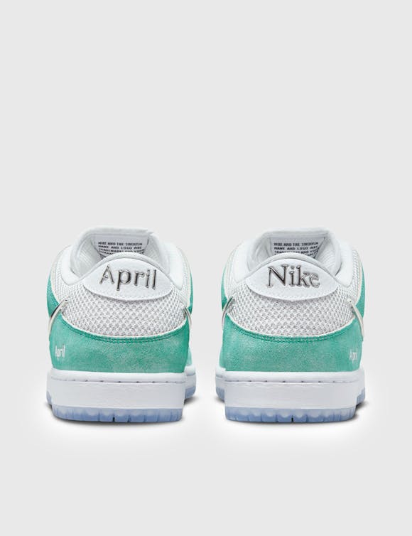 The SB Dunk Low by April Skateboards mixes sleek design and artistic touches derived from their brand story. Striking style from the ground up, the April Dunk Low starts with an icy translucent outsole that reveals custom rose art by April. Contrasting the bold Turbo Green suede overlays with white mesh and leather contrasting panels, the April Dunk Low brings in metallic finishes to the back tab logo, April branding, and molded silver Swooshes for a futuristic finish.